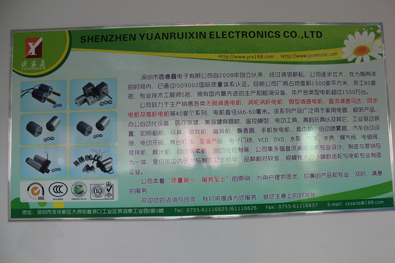 深圳市圓睿鑫電子有限公司自2008年創(chuàng)立以來,經過誠信耕耘,在為期兩年的時間內,已通過ISO9001:2000國際質量體系認證。公司廠房占地面積2000多平方米,員工100人,專業(yè)技術工程師6名,擁有國內最先進的生產和檢測設備,年產各類減速電機超過2~300萬臺。因公司發(fā)展需要,于2020年底,將生產基地遷往擁有最美小鎮(zhèn)之稱的東莞市清溪鎮(zhèn),依山傍水,依托美麗的大自然環(huán)境和地方文化,全新的東莞市圓睿鑫電子有限公司將借助深圳母公司平臺,一步步走上新的臺階。 東莞公司將繼續(xù)致力于生產銷售各類無刷減速電機 渦輪渦桿電機,微型減速電機,直流減速馬達,交流手搖發(fā)電機、同步電機及空心杯電機等,電機直徑從6-60毫米為定位,系列產品廣泛用于智能家電、智能辦公自動化設備、智能醫(yī)療、美容健身器材、遙控模型、電動工具、高檔玩具以及其它工業(yè)驅動裝置,如高檔玩具、游戲機、麻將機、飄香器、手機發(fā)電機、柔巾機、自動噴霧器、汽車自動設施、電動牙刷、舞臺燈飾、圣誕產品、智能電子門鎖、VCD、DVD、水泵、氣泵、水表、煤氣閥、電磁閥、攪拌機、榨汁...